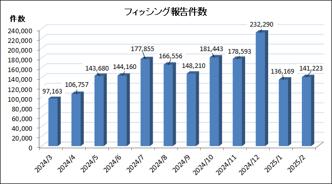 2025 年 2 月にフィッシング対策協議会に寄せられたフィッシング報告件数 (海外含む) は、前月より 5,054 件増加し、141,223 件となりました。