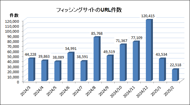 2025 年 2 月のフィッシングサイトの URL 件数は 22,518 件となり、2025 年 1 月と比較すると大きく 21,016 件減少し、約 48.3 % 減となりました。