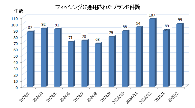 2025 年 2 月に報告を受けたフィッシングに悪用されたブランド件数 (海外含む) は、前月より 10 件増加し、99 件となりました。